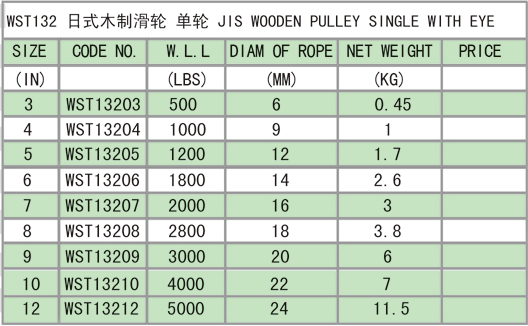 • 產(chǎn)品描述:日式木滑輪同美式木滑輪的標(biāo)準(zhǔn)不一樣,但是其用途是一樣的,都是用于船舶帆桅的升降,因?yàn)槟倔w設(shè)計(jì)既防水防腐,質(zhì)量又輕。主要用于尼龍繩作業(yè)。產(chǎn)品的尺寸從3寸到12寸,適用繩徑從6MM到24MM。