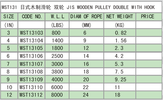 • 產(chǎn)品描述:日式木滑輪同美式木滑輪的標(biāo)準(zhǔn)不一樣,但是其用途是一樣的,都是用于船舶帆桅的升降,因?yàn)槟倔w設(shè)計(jì)既防水防腐,質(zhì)量又輕。主要用于尼龍繩作業(yè)。產(chǎn)品的尺寸從3寸到12寸,適用繩徑從6MM到24MM。
